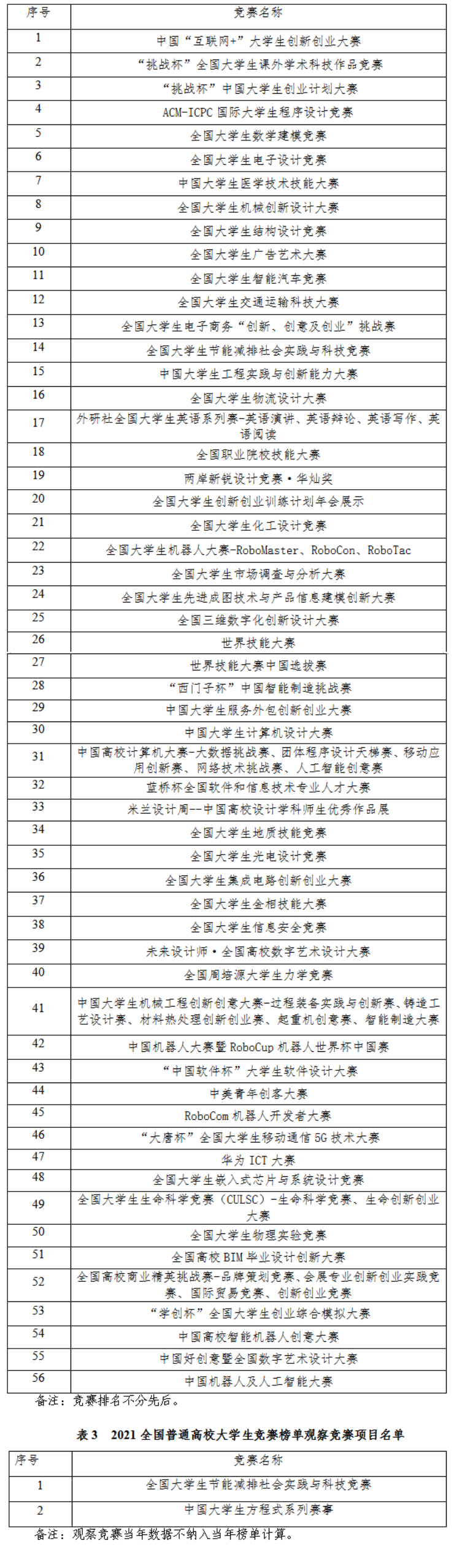 2022年2月22日,中国高等教育学会高校竞赛评估与管理体系研究工作组发布2021全国普通高校大学生竞赛分析报告,其中包含本科院校大学生竞赛榜单13个、高职院校大学生竞赛榜单10个、省份大学生竞赛榜单3个。