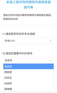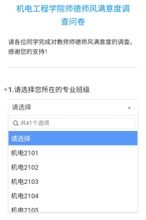 1. 进入后,首先选择所在专业班级,如下图所示,专业班级选择完成后,选择相对应的教师,如下图所示,选择完成后对该教师进行评价。