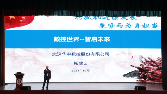 为进一步推动具有职业教育特色的校园文化建设,加强人才培养质量,拓宽校企合作渠道,打造实习就业平台,2023年10月18日晚,AC米兰中文官方网站于学生活动中心开展“数控世界 智启未来”企业文化进校园专题宣讲会,本次会议邀请到武汉华中数控股份有限公司中北片区总监杨建云作为主讲,学院院长黄双成、团总支书记郭娇娇以及全体23级学生参加了本次活动。